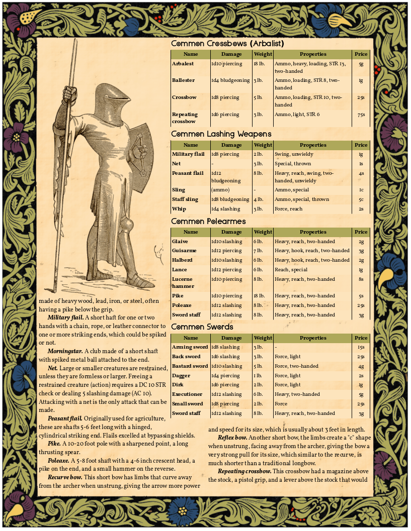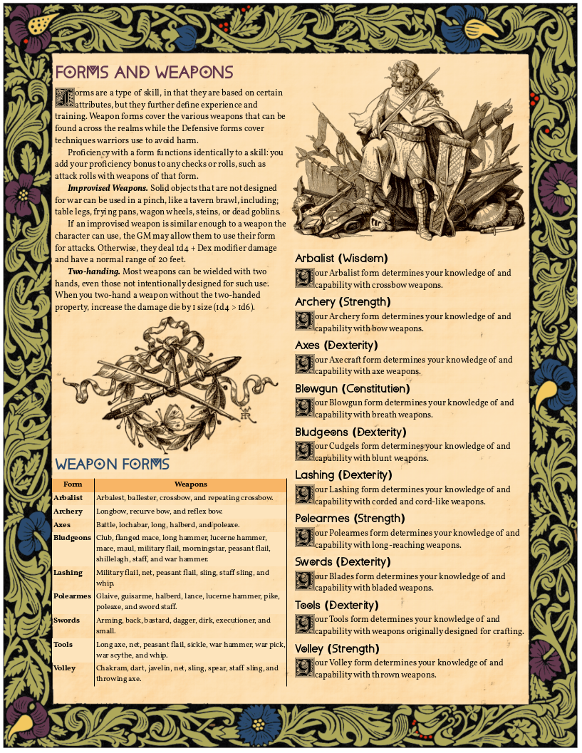 It took me a while to figure it out, but now it's here. The weapons are broken down into groupings, some of them overlapping, naturally, and each grouping has an associated skill. Just as with the rest of this project, I have laboured to add a bit more "medieval" to the whole thing, so some names are changed, some functions manipulated, and I even added some stuff that I thought was missing.